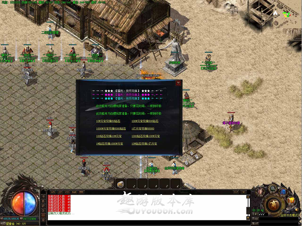 游戏介绍:本服承诺无任何游戏合成,所有均为〈元宝〉,元宝决定一切,人人可玩。 游戏介绍:元宝 本服唯一货币,可用来提升人物等级,装备元素,锻造高级物品等等。 游戏介绍:元宝比例1:100000,额外赠送200点钻石和1点游戏点,可以购买会员礼包。 游戏介绍:本服钻石可以通过打怪获得(神话以上级别的怪均有产出)一小时轻松几千钻石!!! 游戏介绍:本服唯一销售为赞助会员 会员分4个档次 领取QQ礼包送普通会员,绝无隐藏。 游戏介绍:元素为主打(必升) 满元素打怪快,无元素打怪慢,至尊级以上怪物攻击高,没减伤元素顶不住伤害。 游戏介绍:装备最好是先升级龙魂,7层有个必爆武器房间可自由挑选本职业武器,三大陆在82级地图,到了三大陆才是你扬帆起航时刻。 游戏介绍:极品:游戏打怪爆出装备 捡取机率触发极品攻魔道 ( 武器最高+7 衣服最高+8 首饰最高+9 腰带 靴子 无极品)。 游戏介绍:高级装备如→传承类类 时装 宝珠 回血石 特殊戒指 奇门四格 这些装备无极品 可在遗弃之城鉴定极品属性。 游戏介绍:铸星:铸星可提高装备极品属性,最高可铸9星 每次随机攻魔道+1 F9背包打开 装备升星图标 商铺购买加星锤。 游戏介绍:推荐打到好的极品装备或高级装备再铸星 如打到极品+7-9装备或特殊高级装备 天怒剑甲类装备 即可尝试铸星。 版本介绍:本服6种元素-(暴击几率 攻伤伤害 物理减伤 魔法减伤 忽视防御 人物体质) 每种元素都有独特的性能。高极品或特殊高级装备切记一定要弄元素(战士法师强力推荐) 不要舍不得那点元宝。 版本介绍:锻造碎片可用来锻造特殊装备必备材料,游戏可打怪爆出,也可商铺购买,后期多余可回收元宝。。。 版本地址