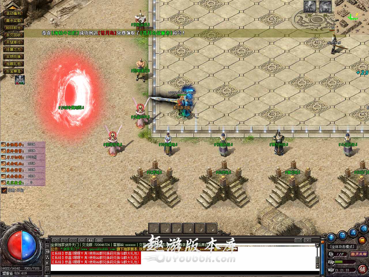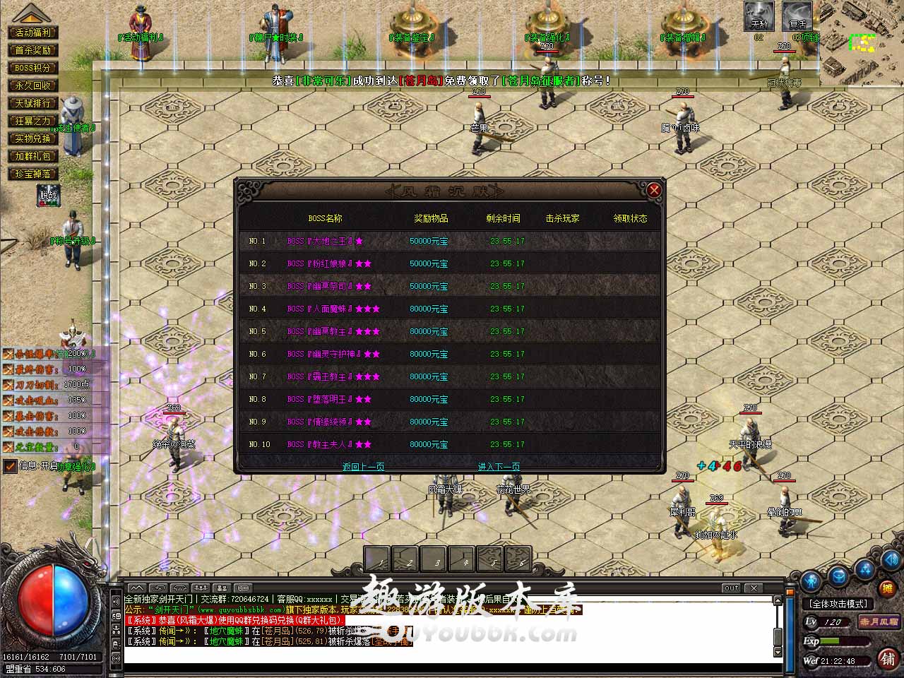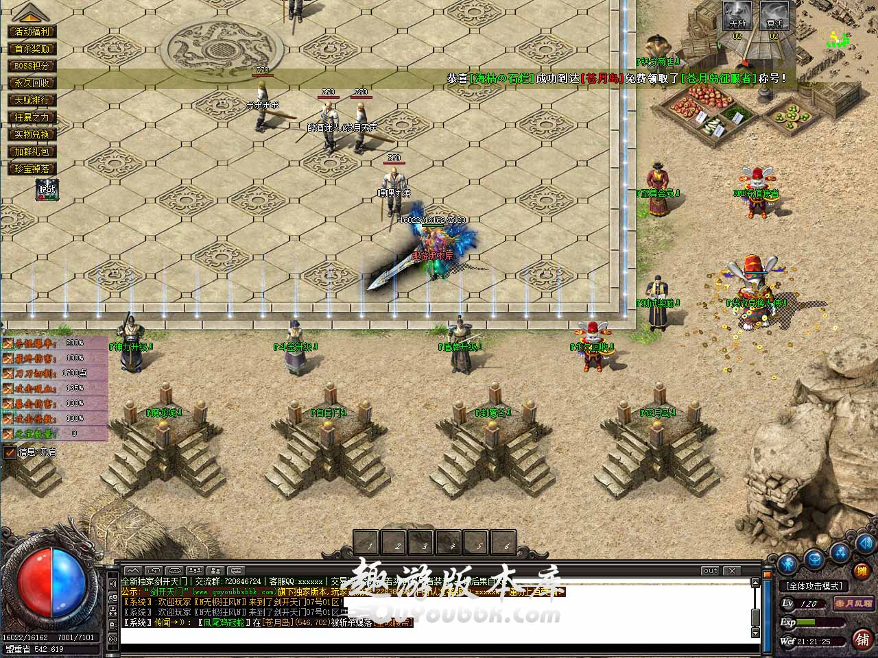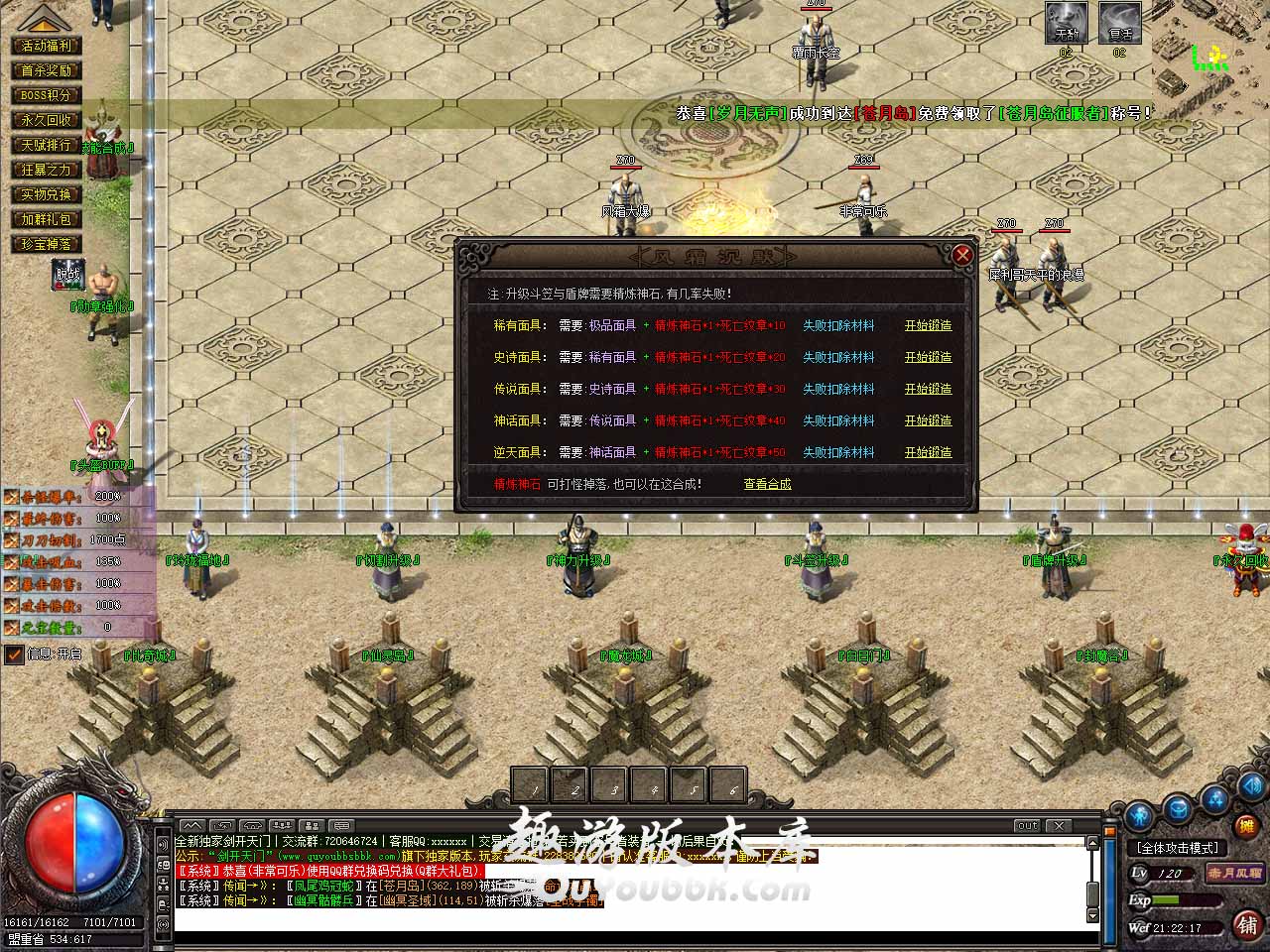 版本介绍:本服爆率已经过测试,除去一些垃圾装备和地图,各种系列装备均可在怪物身上爆出,爆率不难。 版本介绍:如果你在游戏中发现任何漏洞,请告诉我们,只有你们的支持,我们才会做得更好!走的更远. 版本介绍:游戏在好玩也要注意劳逸结合,不要因为玩游戏而伤了身体就不划算了,本服务器不能使用任何外挂,打造绿色传奇。 版本介绍:头盔鉴定出BUFF,每次鉴定需要[50000]元宝,鉴定共分为〖B级、A级、S级、传奇〗四个级别。 绿色BUFF 攻伤一阶:攻击伤害额外增加10% 斩战一阶:有几率瞬间打掉对手10%HP量 打宝一阶:打怪爆率额外增加20% 遮天蔽日:有几率使对手致盲3秒 毁灭之力:有几率使对手攻击倍数消失5秒 生生不息:被攻击有几率恢复20%HP量 力量之王:攻魔道+60点 版本介绍:【切割之力】每一级都会提升一定攻击.防御.生命值.魔法值.刀刀切割(仅对BOSS有效)升级装备需要材料1:[修炼石],升级装备需要材料2:[修炼手镯],升级装备需要货币1:[元宝],升级装备需要货币2:[积分],所有材料都可以打怪获得,材料爆率:高!!!升级过程中禁止取出装备.禁止满包裹.卡材料.卡装备,有可能装备会因此消失!在NPC弹出的对话框右边方框内放入切割装备即可查看需要材料数量。 版本地址