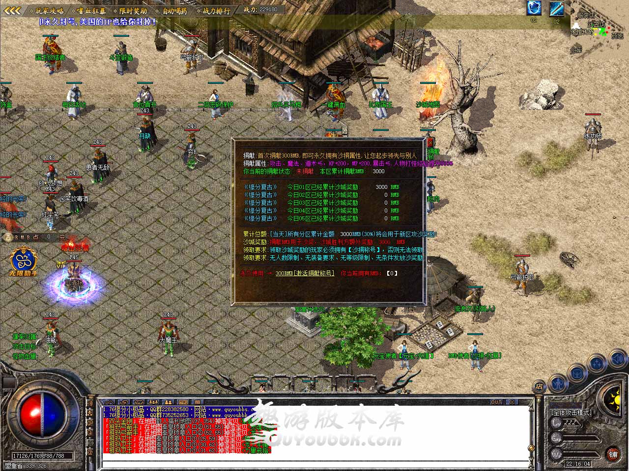 本服无任何拖,玩的全部是真实,复古玩法,经典怀旧,喜欢传奇的散人朋友耐玩。 免费玩家:上线领取QQ群礼包(礼包码:666666),内含【技能秘籍(所有技能提升至3级) 金砖*5+超级祝福油*3+金钻服务】 速度去打怪,有首爆和升级奖励之类的福利 。 前期发展推荐:领取赞助→领取幸运礼包→领取国王终结者→开藏宝图(双击点传送再双击点挖宝)→开狂暴→个人捐献→沙捐→领取每日挂机时间(进地图后开三倍经验,)→包厢练级(开三倍经验)→闯天关→挑战隐藏BOSS→领取每日礼包。 小资玩家玩家发展路线和快速升级50级方法: 首先上线领取福利礼包,然后领取挂机时间(国王双倍)进入挂机地图后开3倍经验刷完一圈等级会达到45左右,之后去闯天关(1次2E-5E经验不等)前期打到的牌子如果想打金就出给高等级玩家。 如果想自己发展就吃了换取经验,(赤月令牌为本服高消耗品,请慎用),冲的元宝可以去包厢练级,购买400练级次数(国王500次),每天凌晨会重置刷新次数(记得开3倍经验),如果当日还有剩余次数可以换回元宝,闲暇之余就可以区挂机地图刷一圈。 闯天关运气好可以打到藏宝图或者隐藏BOOS入场券 ,打到的BUFF装备可以回收游戏点,累计游戏点然后可以换取相对应的大礼包,天关每天10次得刷完(国王20次),世界BOSS活动必须参加,运气好捡到东西。 版本地址