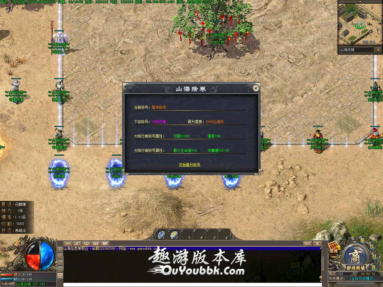 版本介绍:最新专属版本,一切靠打,装备材料保值,全民追梦BOSS,散人玩家天堂。 版本介绍:千件专属装备全部爆出,一个好玩充满探索奇妙的山海大荒异兽世界。 版本介绍:开启幸运活动,等待区300秒开启活动地图出现一只幸运之灵,幸运之灵爆出唯一切割武器(妖刀)全民捡取! 版本介绍:内测玩服公测赠送福利,可获得山海赞助+沙城捐献+狂暴之力。 版本介绍:开放攻速晋升,专属神器·兽首[攻速]可锻造,如果系统检测到你没有佩戴兽首,就会提示从一级开始锻造呢,简单高效拥有超级攻速。 版本地址
