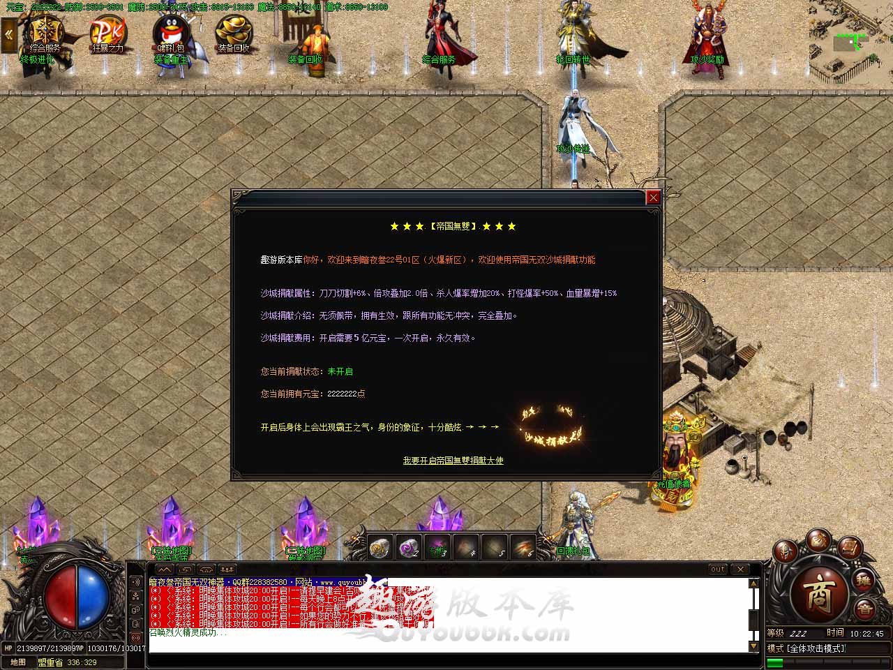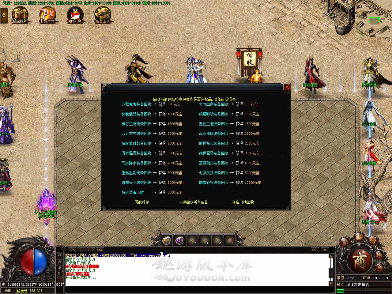 版本介绍:上线在出生地必须要先领取Q群礼包,才能开始游戏。Q群礼包码:666888,为啥一定要领取Q群礼包,对打怪有很给力的一个作用,所以必须要领取,重要的事情说3遍。 版本介绍:直接送满级满转(满级120级,满转23转,土城站10分钟就满),转生npc在土城中间,转生给予真实倍攻,实时叠加。满级满转后,散人开始各个地图找怪物打。每个怪必爆50游戏点,后期地图更是必爆50-5000游戏点。(所以散人花时间一定可以跟土豪玩家一样,可以领满回馈,可以下最好的地图)。 版本介绍:在一大陆地图打够1000游戏点以后,直接去二大陆的1000游戏点地图。因为刚开始肯定人多怪少。所以合理安排。没怪了就继续换图打游戏点,开区半个小时后开启跑酷活动,跑酷每次给予20-50点游戏点,游戏点可以领取回馈,可以下地图(详情查看游戏回馈跟第二大陆地图要求)。游戏点还有一个来源就是,找大哥,让他们打限时装备给你去领取限时奖励。第二季的限时装备,必须装备放在背包,手动点击领取。【单区80万奖励】先领先得。 版本介绍:本服中期地图以上的怪物均有几率爆出终极,金色名字地丁怪物及二大陆游戏点地图红色名字怪物为本服最高爆率,欢迎大家游戏内体验!!! 版本介绍:目前第二季剑甲及首饰,为最高21级。特殊装备,最高12级。 版本介绍:神器系统在土城左下角,目前设置剑甲及头盔给予技能强化随机鉴定,烈火、开天、逐日,随机鉴定0-9重,9重技能在手,天下我有,谁用谁知道,逮谁秒谁。 版本介绍:本服简单耐玩,各种活动全天24小时开放,活动必参加特别是每晚22点10分的年兽活动(必爆终极),欢迎各位玩家上服体验。 版本地址