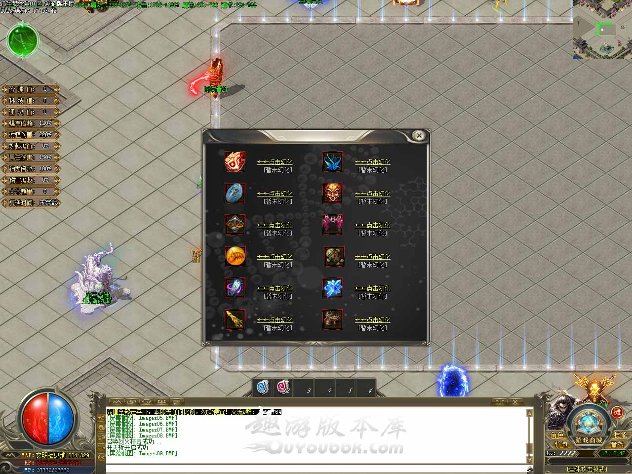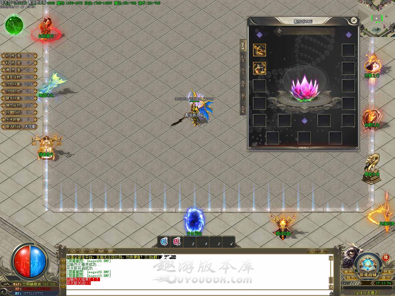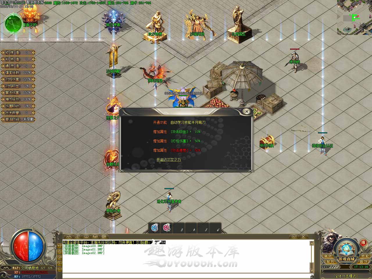 版本介绍:测试区装备回收获得的进元宝,正式开区可在我这里领取,测试期间系统将自动为你记录限时奖励,无需任何手动操作,测试区回收的元宝返还100%。 版本介绍:开启狂暴功能后可自动学习技能半月弯刀。增加属性:[攻击吸血]+10%,[打怪伤害]+50%/,[攻击速度]+50%。 版本介绍:新增项链幸运玩法,幸运3点之后几率失败,失败后会降低1点幸运,本服幸运+10触发最大攻击伤害,项链幸运3以后增加暴击伤害,每次强化需1000元宝 项链幸运3点 暴击伤害 + 2%。 项链幸运4点 暴击伤害 + 5%。 项链幸运5点 暴击伤害 + 8%。 项链幸运6点 暴击伤害 + 10%。 项链幸运7点 暴击伤害 + 15%。 项链幸运8点 暴击伤害 + 20%。 项链幸运9点 暴击伤害 + 30%。 版本介绍:在游戏中等级提升大师NPC处可提升等级,免费经验丹:使用后增加人物100000000经验,元宝经验丹:使用后增加人物200000000经验。 版本地址