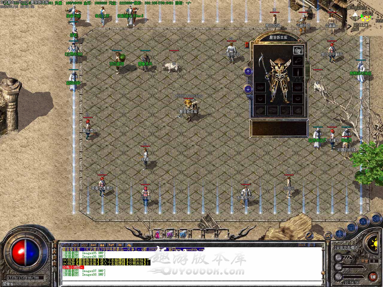 版本介绍:新增冲级奖励,对于复古版本来说不可少的功能,本服最高等级52级,玩家达到52级可以领取三职业武器一把,另外加金条一根,每个职业只有两个名额。 版本介绍:玄武活动,必须有公益赞助玩家才可以进入,每次进入需10万金币,每半小时刷新一次,七大BOSS! 版本介绍:新增玄武之巅地图,进入三层需要30金刚石或30元宝,每3小时刷两只,5.1活动怪物,除爆出终极装备外,唯一机会爆出玄武勋章。 拿沙介绍:每周6上午10点开放一个区,每个月合区一次12点合区合区1-4晚上8点集体攻沙!攻城奖励:城主武器 + 1000元宝,攻沙结束后,占领沙巴克城主进入此地图领取奖励。 版本介绍:新增随身泡点,随身双倍泡点仅限五一期间开放,随身泡点需要一定金币才可以激活此功能,每秒400金币,可到55级,每秒获得800经验。 版本地址