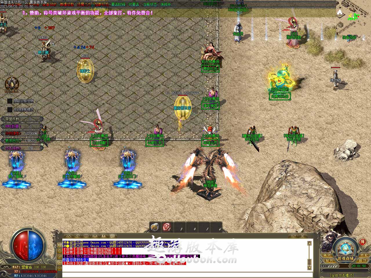 版本介绍:新增生肖合成功能,为了长期开放耐玩,每件生肖需要2游戏点直接合成,属性:单件加血80万,十二生肖等级+1一套触发血量、防御、攻击力等。 版本介绍:本服增加高爆地图,15分钟、最高掉落2230装备爆率极高,此地图为3层真实爆率加成【200000%】,等级需要2300+[500枭雄币]才能进入。 版本介绍:乾坤玉玺SS可合成,附特殊属性超级BUFF,几率提高,爆率增加1000%,还可获得探测属性,并且免疫冰冻属性,需要乾坤玉佩S+5亿元宝+5亿金刚石+5888积分,散人合成成功率[5%] 合成失败元宝。金刚石。积分失败消失(装备不扣除)。 版本介绍:如果你集齐了38个神力碎片,可以在免费打造超级神力,传闻魔神BOSS会掉落材料,并且有一定的几率直接掉落魔神之力,可以为你召唤BOOS,但每次需要一定的游戏点,剩下就全凭你的运气了,每次召唤需10游戏点,有几率直接掉落魔神之力哦。 版本介绍:新增超级元素洗练,每次洗练随机给予装备6-10点元素属性,最高可洗练出10点元素属性,每次洗练需消耗10游戏点,洗练武器元素属性暴击几率增加;洗练衣服元素属性物理伤害减少;洗练头盔元素属性:魔法伤害减少;洗练项链元素属性增加目标爆率。 版本地址