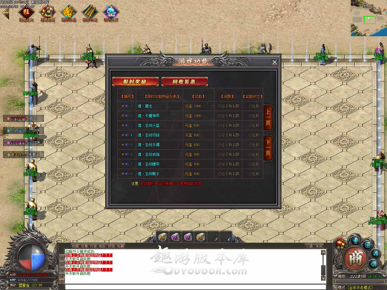 补丁大小:4.05GB,PAK补丁全部一次加密,测试客户端:17周年纯净端。游戏兑换码:888888,版本使用了ESP插件,开启了大背包功能。修复土城没有小地图的问题。