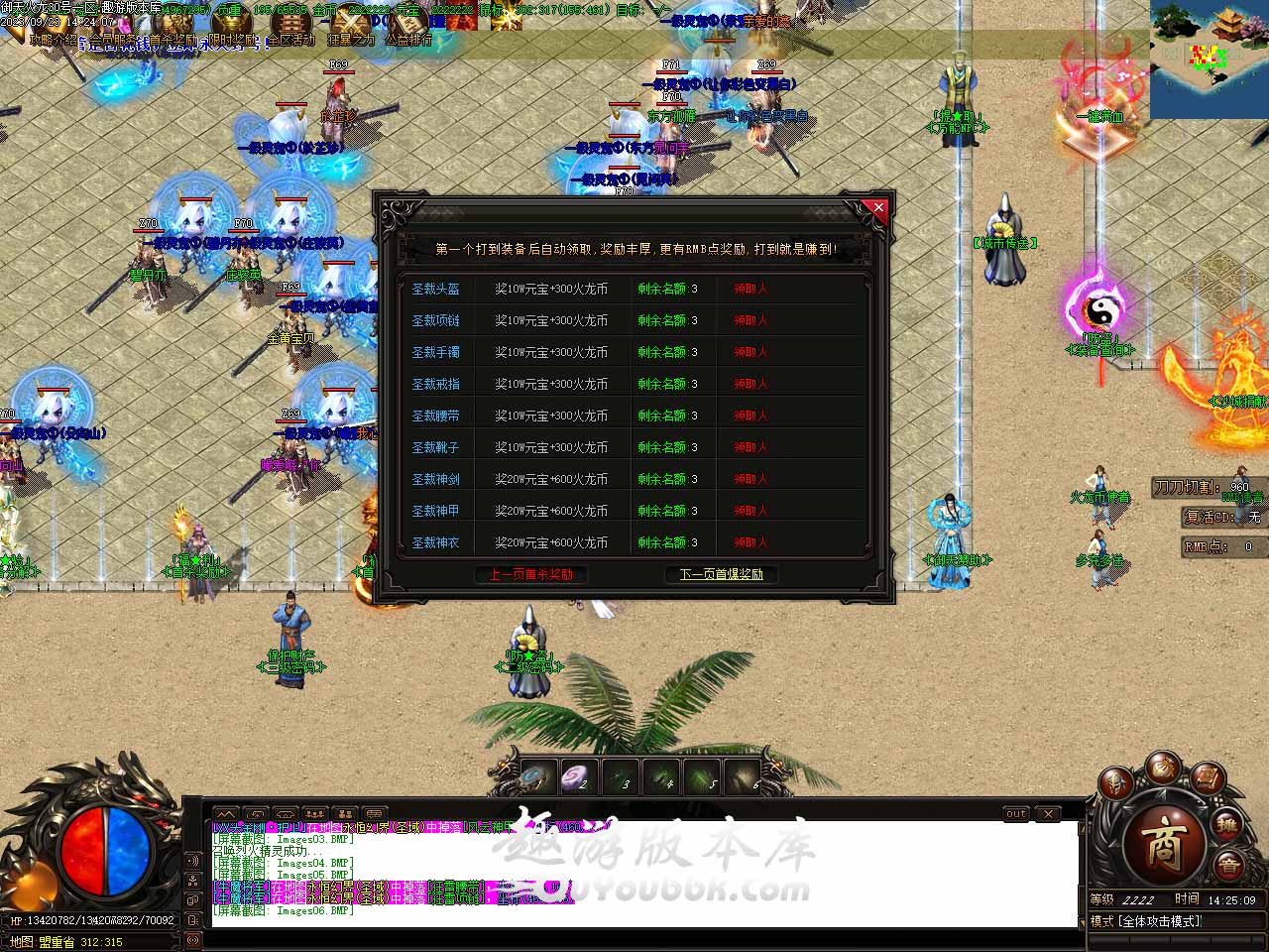 版本介绍:此版本测试区开放测试奖励,仅限测试区[回收装备]的元宝,自动记录,比例为100‰,测试区100元宝新区可以领取100元宝,开区后需要在此处NPC手工领取,自动记录,无需操作。 画地为牢:攻击有几率使对方禁锢3秒(禁止回城 随机) 恶魔附体:血量低于50%触发无敌三秒(CD时间180秒) 版本介绍:本服大量精彩活动一定要参加每项收益超多,除新手地图以外所有地图均爆终极! 版本介绍:新手可以在土城永恒幻界发展,获取大量首打首爆,可以快速五转,五转之后可以进入第二大陆下五转地图或者去激活無雙殿! 版本介绍:通天神塔三层必爆可回收装备实物,诅咒勋章200左右可以开满,也可以自己打火龙币,可叠加切割倍数,最高5倍可配合称号叠加最大切割!完美之主活动必爆实物,玩家千万不要错过!!! 版本介绍:泡点可以直接泡到88级之后可以开经验宝箱和灵魂盒子。灵魂魔石可以从守护怪物爆出也可开灵魂盒子。 版本介绍:虎符洗练可获得20多钟BUFF,本服BUFF便宜又简单,次数上限极低。虎符神殿分为4层,每层爆率叠加很容易出终极装备。 版本地址