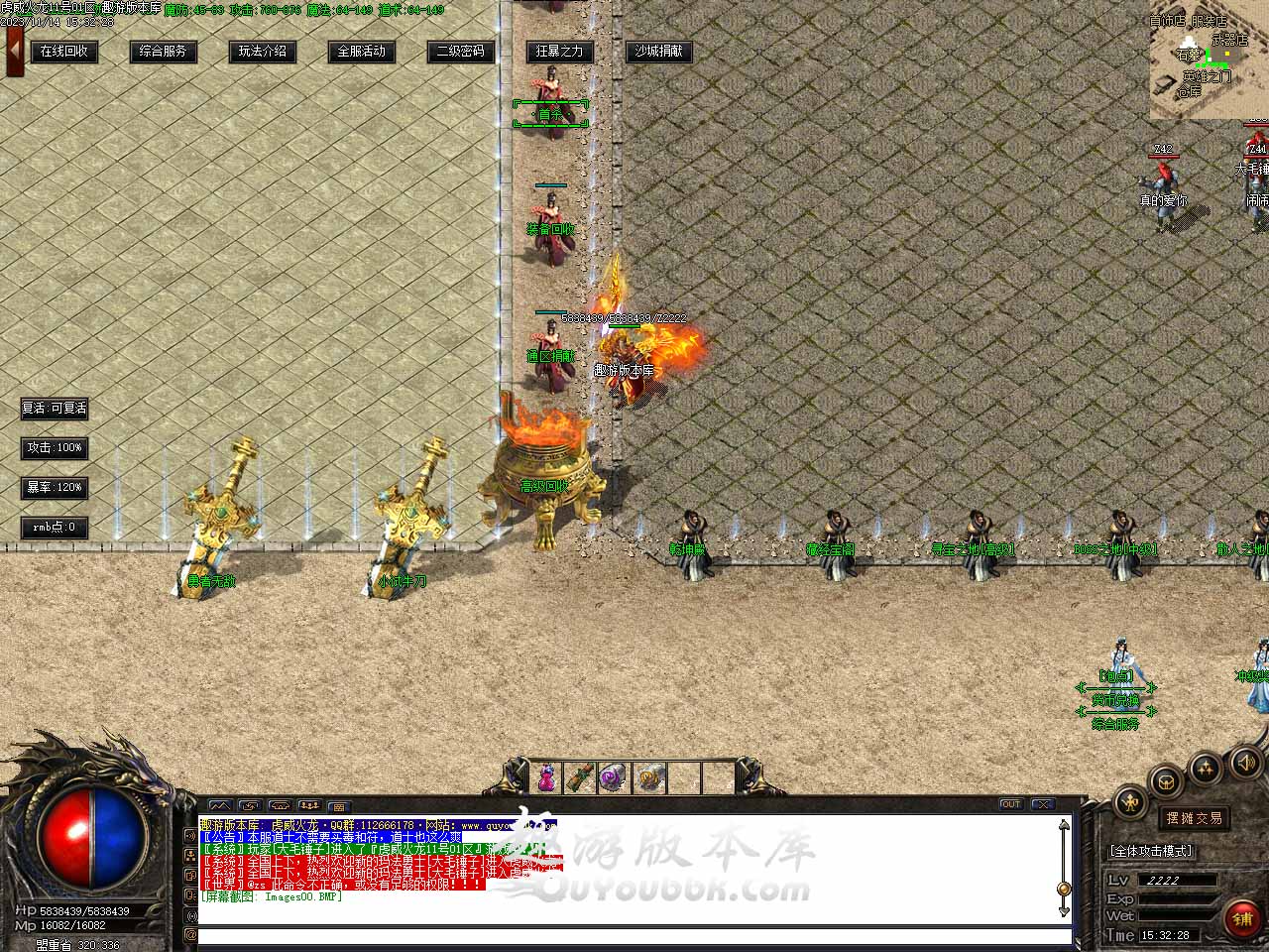版本介绍:本服道士不需要买毒和符,道士也厉害,本服推出游戏点系统,打怪练级有可能出游戏点,兑换等值元宝! 版本介绍:如果玩家看不见强化技能,请更新最新客户端即可! 版本介绍:此传奇版本武器属性可升级,是否觉得你的武器不够威风?是不是想让自己更加强大呢?没关系,我可以帮你实现你的愿望,而你只需要出少量的元宝,可升级魔法、攻击、道术,每升一点属性需要 [100000]个元宝+1000积分+终极碎片*10,100%成功喔,每把武器最高可以升级[10]点属性!你准备好元宝了吗? 版本介绍:本服终极地图和各大BOSS有几率爆出终极装备!道士40级召唤7级神兽,45召唤5级虎王,50级召唤2只5级虎王,55级召唤3只7级虎王,60级召唤3只7级白虎神王,65级召唤3只7级白虎圣王,70级召唤3只8级超级虎王。 版本介绍:超神器,免费打造,投入以下材料可升级,点击后输入数量即可捐献对应材料,使超神器增加经验,升级后可获得材料后期超多,在你个人装备上可以看到升级经验,达到要求,自动升级。 版本介绍:本服所有3W2血的BOSS都暴终极和材料,4W血以上的BOSS爆率超高,所有材料全部只爆出来。 版本介绍:本服首次拿沙奖励丰富,新区少奖励多多,1000000元宝+各种奖励--欢迎散人团队玩家长期入驻本服。 版本地址