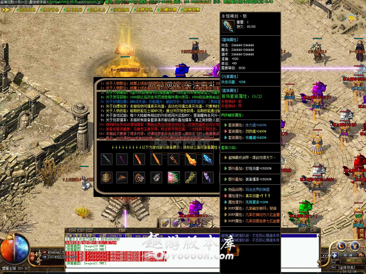 版本介绍:上线领取QQ群礼包,加入提示中的任意群都可获得礼包码、免费获得全部礼包,奖励礼包1:免费领取十倍经验、范围切割神器,奖励礼包2:免费领取随身仓库、自动捡物。 版本说明:玩家上线后要选择战魔或站尊,必须二选一,选择以后可以免费获得以下技能,并且保留战士技能,站尊技能1:终极宝宝召唤神兽(继承人物800%属性攻击,血量,防御),站尊技能2:死亡之眼 (超级群攻技能,一键红蓝毒,超高伤害),站尊技能3:无极真气 (属性翻倍,地球人都知道是干啥的),再次强调:站尊和战魔只能选一,一经选择不可更换,不可更换。 版本介绍:前期技能在土城NPC处,通过书页残卷获得,后期技能通过秘境残魂获得,每个大陆都有相应的升级或闯关奖励NPC,里面藏有去另外一个空间秘密,不可错过。 版本介绍:本服等级好升,0至1000级使用书页残卷晋升,1000至1500使用命运之书晋升,非常好升,1000级以后双击书页残卷每件得20灵符,1500级后使用命运之书获得100点灵符!! 版本介绍:本服装备可鉴定,装备鉴定时每次需要不朽意志令牌1个+50万元宝,武器---攻击强度-护甲穿透-攻击几率:0-8,衣服---攻击强度-护甲穿透-魔法几率:0-8,首饰---攻击强度-护甲穿透:0-3,首饰---攻击次数-魔法次数-攻次伤害-魔次伤害:0-5,三格---攻击强度-护甲穿透:0-5。 版本介绍:此传奇服务端版本新增BOSS封魔谷,地图内刷新无数Boss,不过不要在里面迷路哦,此地图中怪物攻击高、怪物防御猛,玩家中期必争之地,怪物可爆出粉装,红装,金装,紫装等。 版本地址