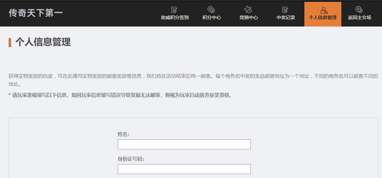 中奖须知: 中奖玩家,请及时进入“个人中心“--“个人信息管理”,填写相关个人及地址信息。